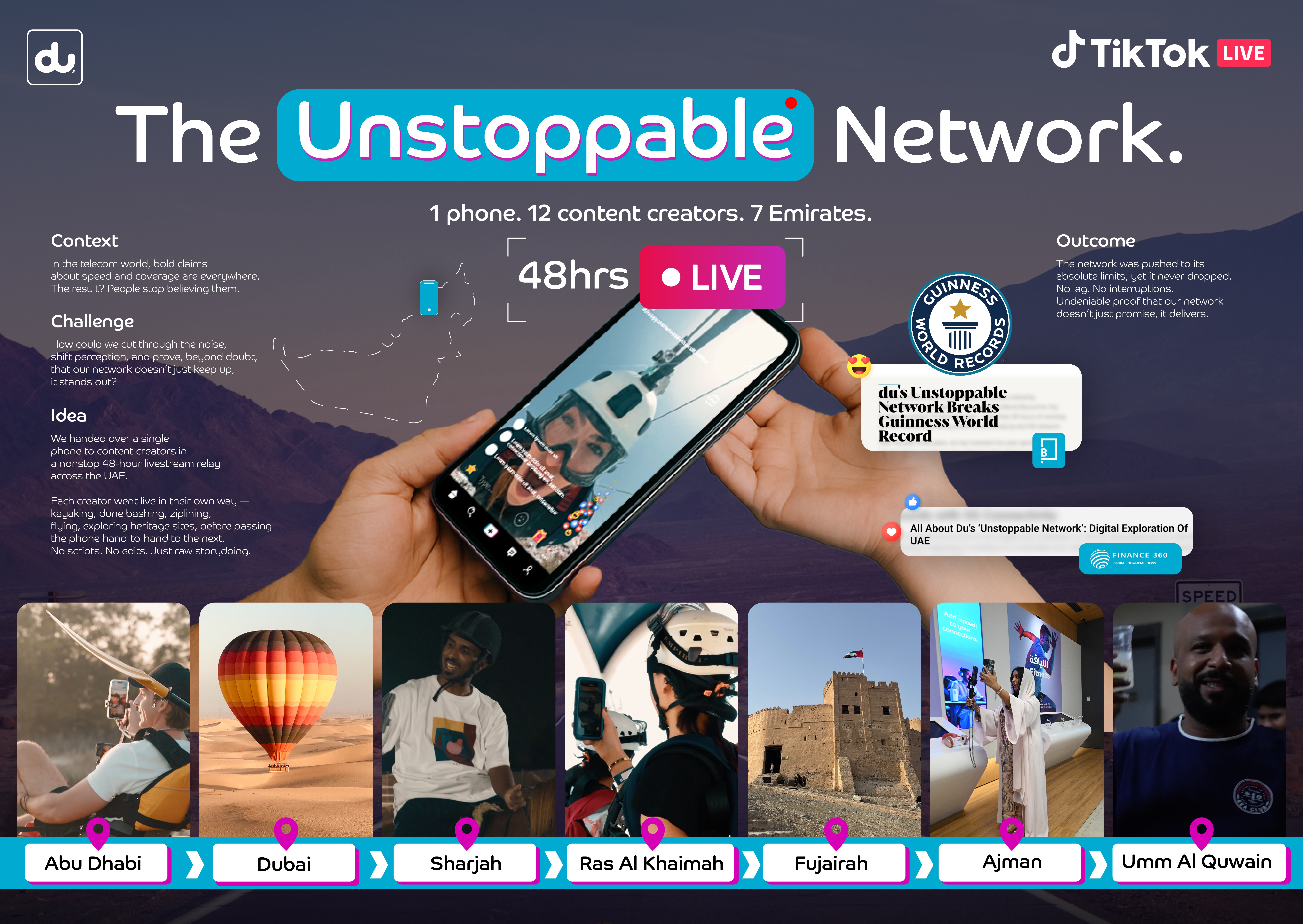 In the telco world, brands always make big claims about speed and coverage, but people no longer believe in words; they believe in proof. So we set out to show, not tell. We launched a 48-hour TikTok livestream relay across the UAE using just one phone, passed from creator to creator in real time. From kayaking and dune bashing ...