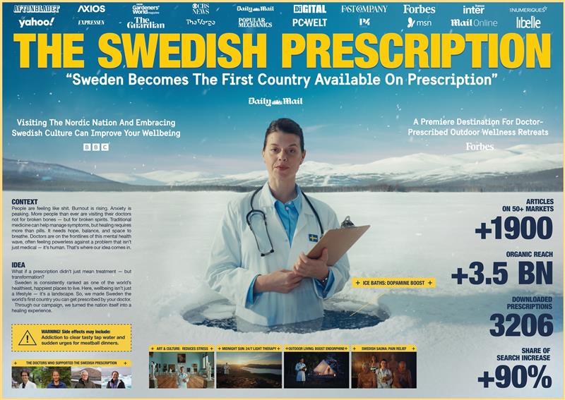 The Swedish Prescription turns Sweden into the world’s first country available on prescription. Built with real doctors across five markets and experts from institutions like Karolinska Institutet, the campaign transforms Sweden from a travel destination into a genuine remedy for wellbeing. Grounded in the global rise of “nature and cu...