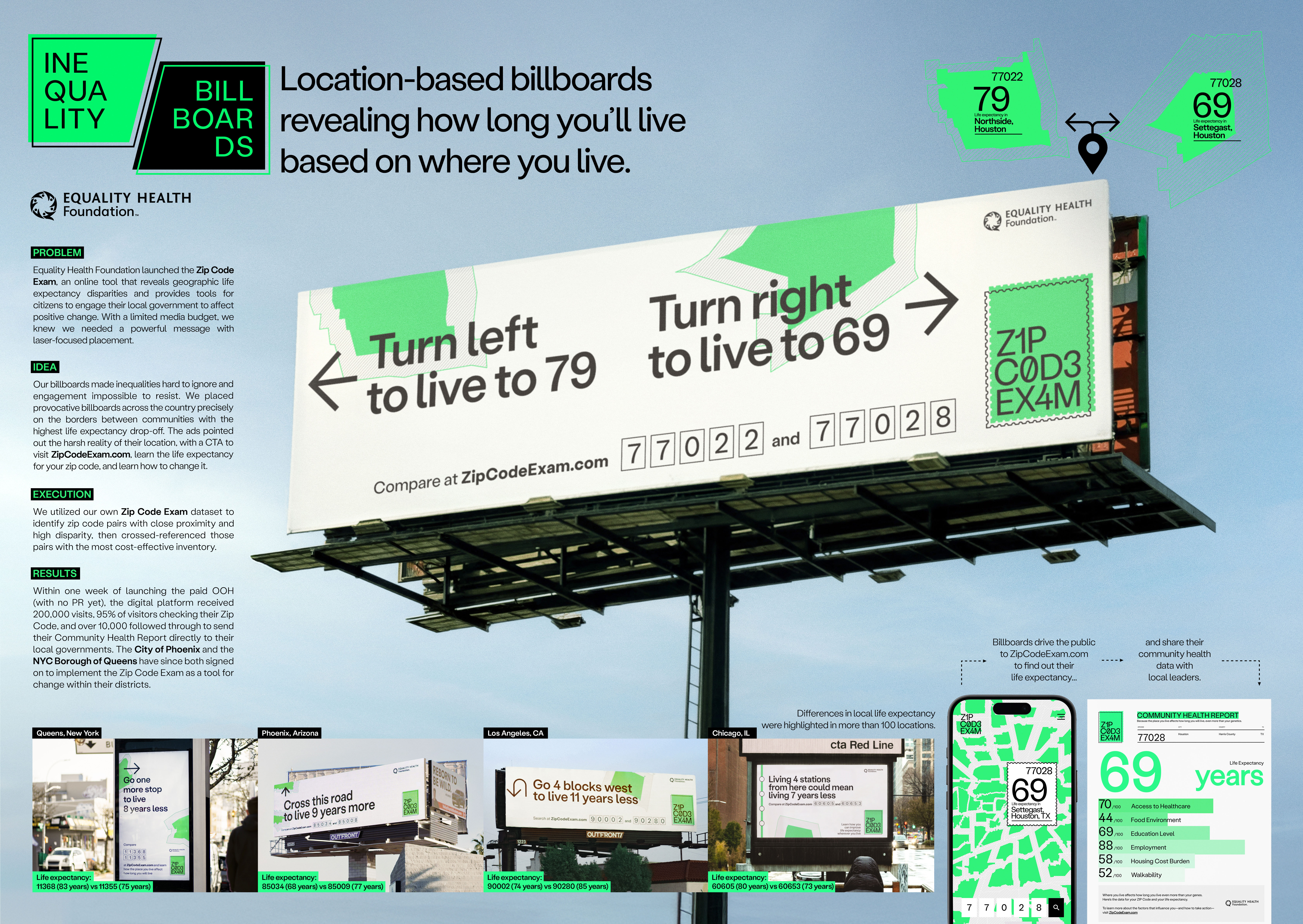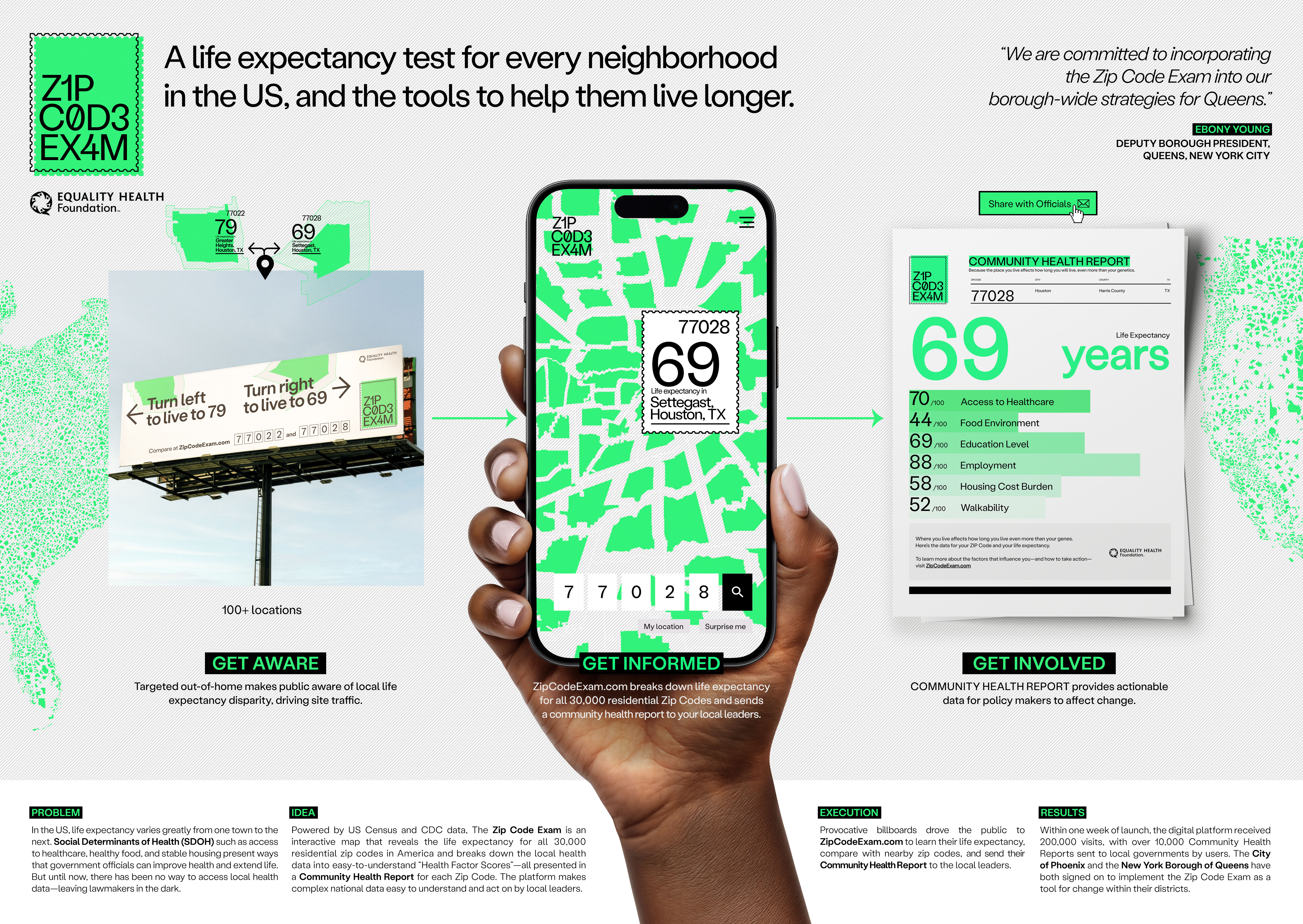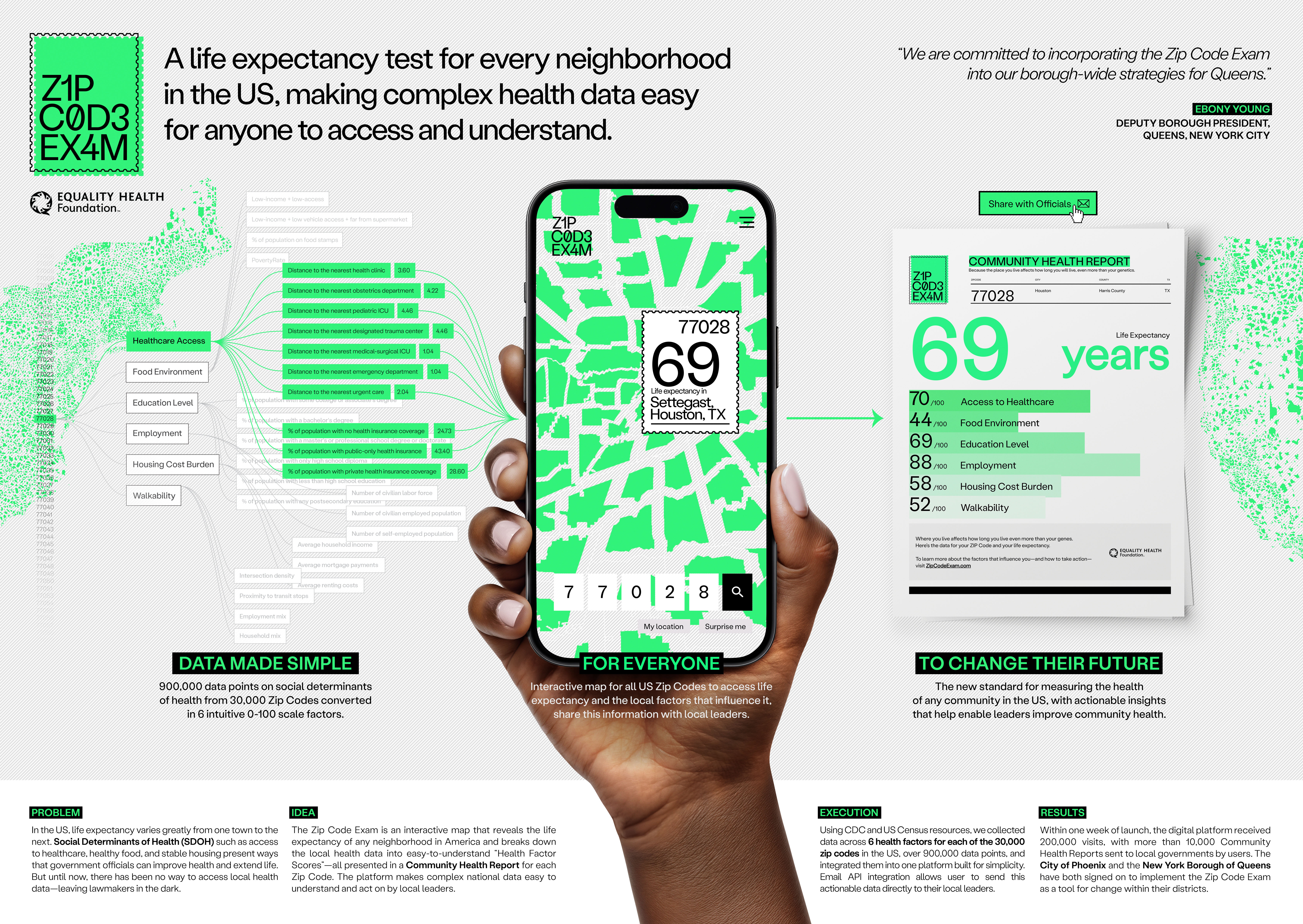This idea reveals what those invisible boundaries around neighborhoods really mean. There’s one piece of information that can predict your health better than any other: where you choose (or can afford) to live. This idea maps public data about life expectancy against all 30,000 residential US Zip Codes, then correlates it...